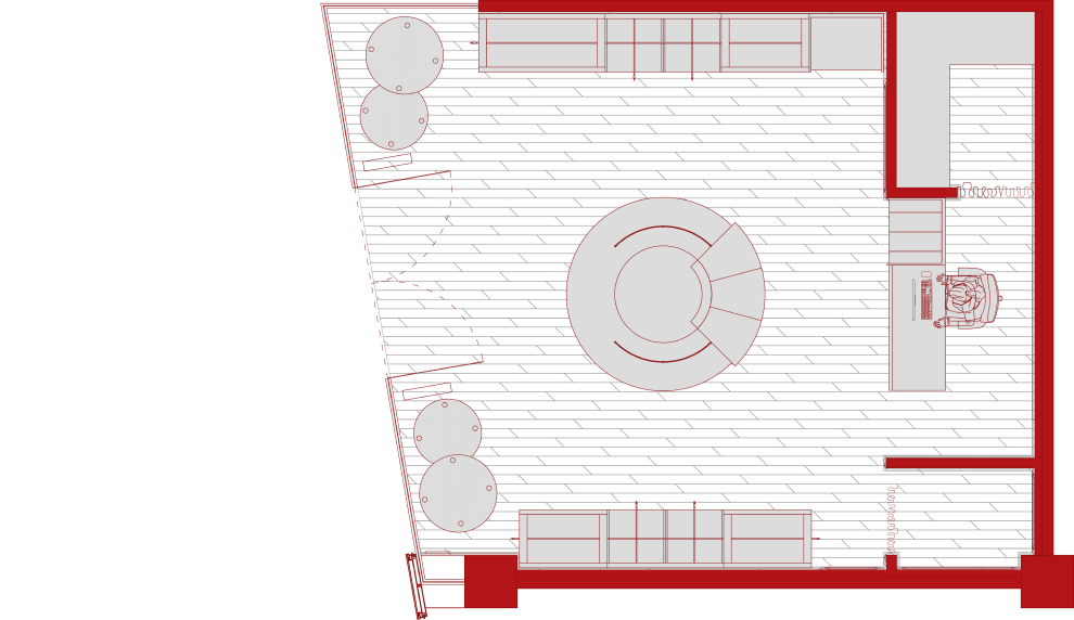 Уют интерьеру придаёт общая цветовая гамма, преимущественно светлая, на полу керамогранит в дизайне под светлое дерево, на стенах еле заметный пастельный оттенок, оборудование в белом матовом цвете. Контраст и динамику форм в интерьере задали фирменные цвета бренда черный и белый. Для воздушности стойки для одежды сделали очень легкими, они выполнены из деревянных брусьев с покраской, с добавлением кованных элементов. Вешала на оборудовании весьма просты и легки, позволяют вешать одежду как плечиками боком, так и лицом к покупателю.