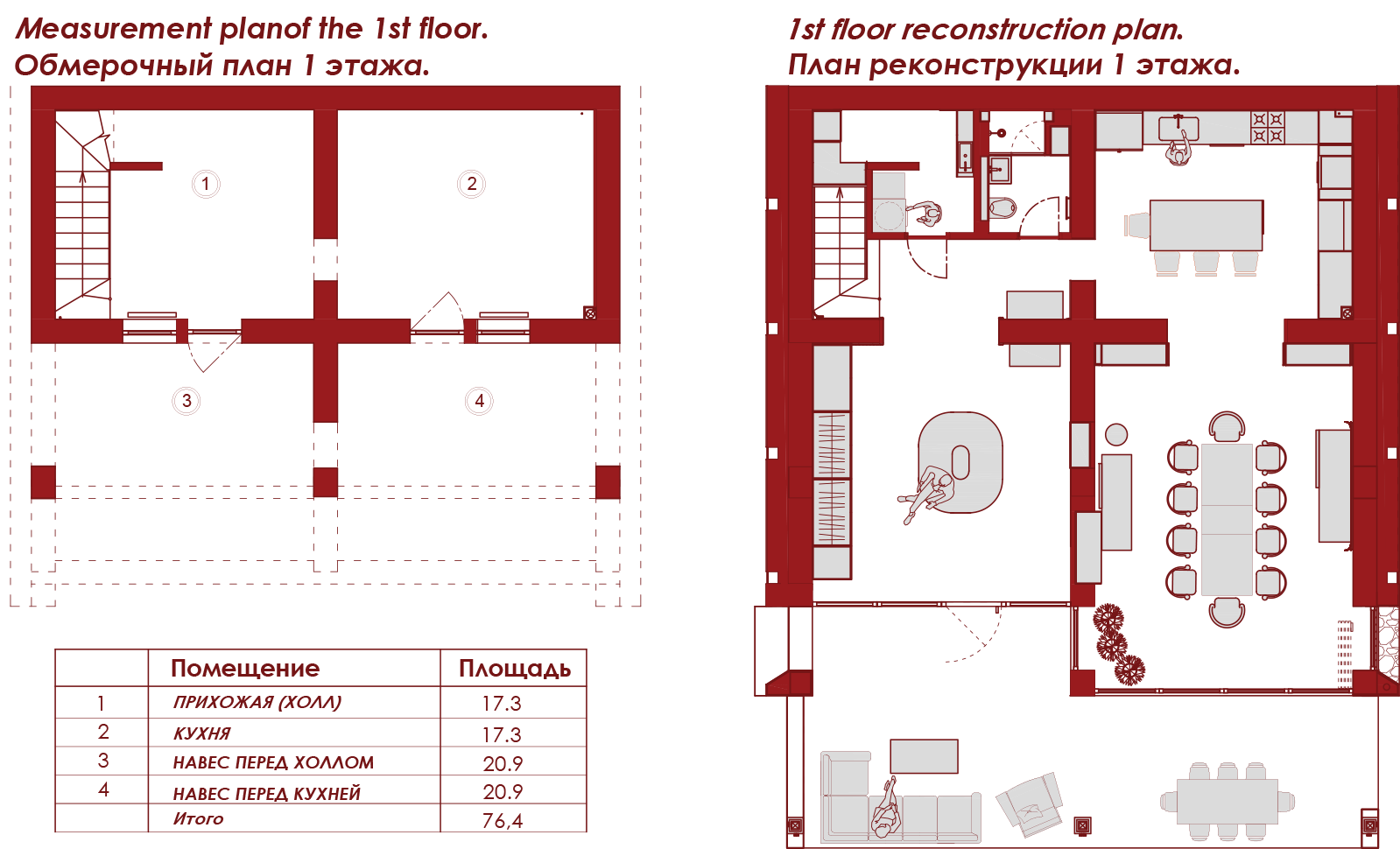 В бюро обратилась семья, недавно купившая частный дом в Алматы. Дом был необычный, первый этаж на половину был интегрирован в рельеф, который имел резкий перепад в рамках участка. Предыдущий хозяин был человеком творческим, он построил своё жилище в виде перевернутого дома, первый этаж выглядел как двускатная крыша, уткнувшаяся в землю, а третий этаж выглядел как фундамент дома, который скрывал односкатную кровлю. Исходя из этих необычных обстоятельств, полезная площадь первого этажа составляла менее 35 квадратных метра, и на первом этаже размещалась кухня и холл с лестничным маршем. Этого было мало для семьи из 4-х человек и одного кота, если не считать повзрослевших детей, которые приезжают в гости.